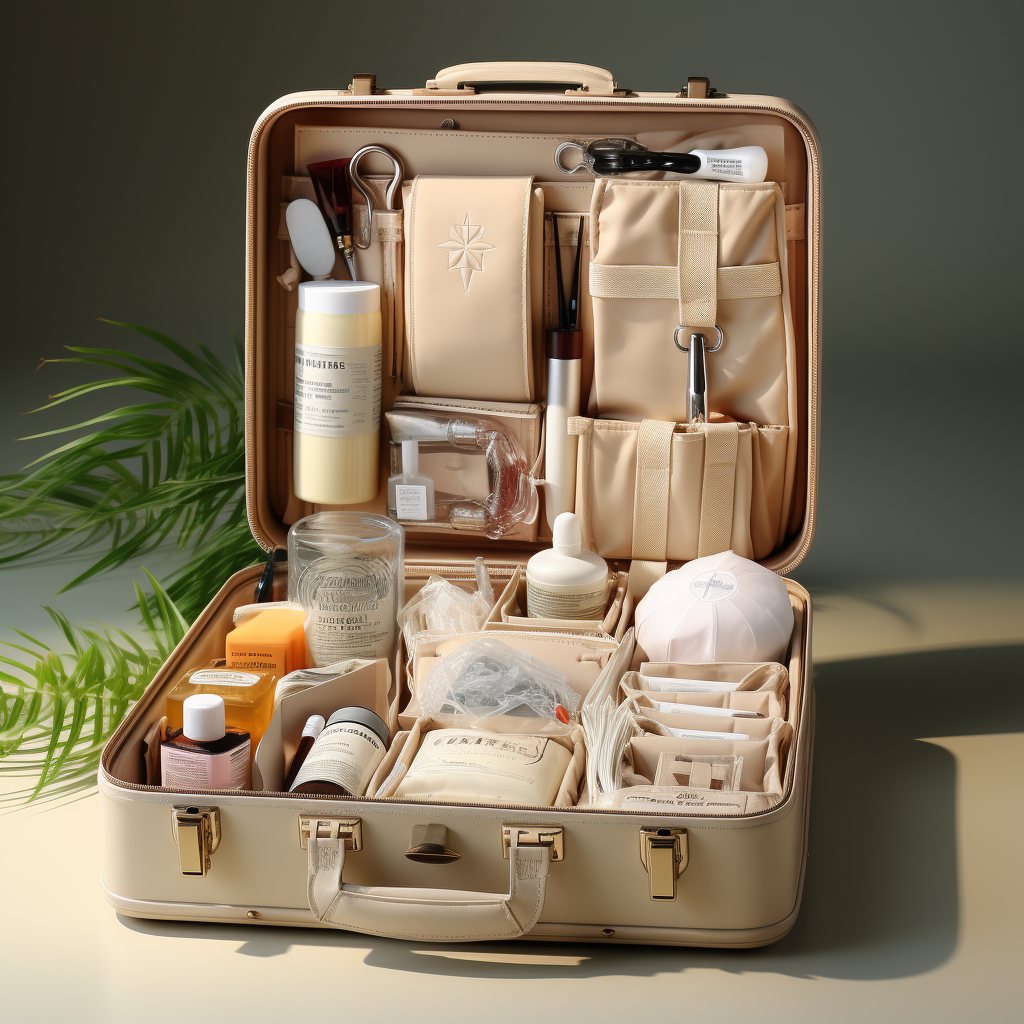 A first-aid kit is a vital component of any medicine cabinet. It typically contains essential items such as bandages, antiseptic wipes, tweezers, medical tape, and a digital thermometer. These items can help you respond effectively to common injuries and health issues, such as cuts, burns, sprains, or fevers.